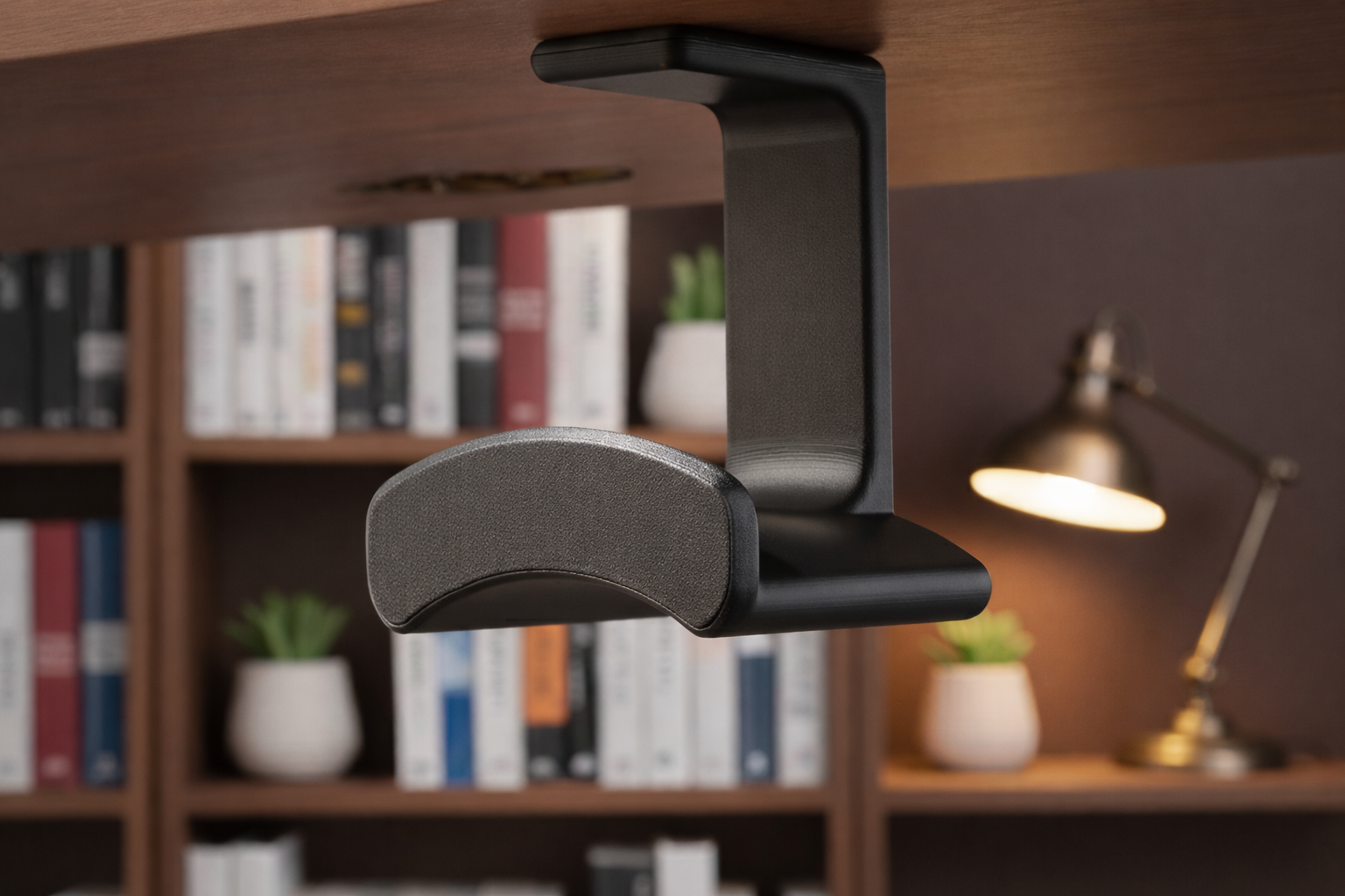 Smidig hållare för hörlurar som monteras under skrivbordsskivan.